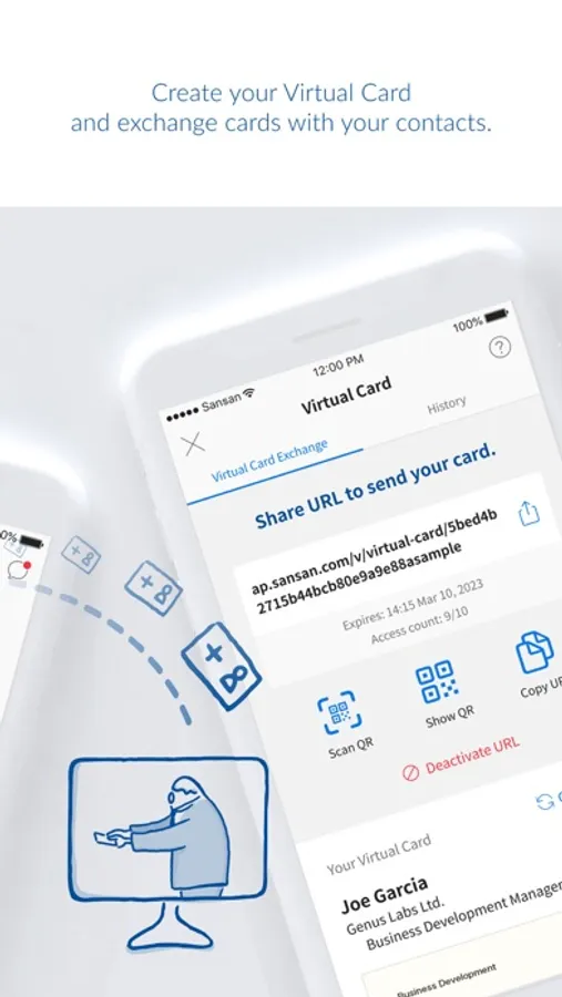 Scan your own business card as the source of your Sansan Virtual Card, Customize it and and exchange it via QR code using the Mobile App. Or use a dedicated URL to exchange cards with anyone when you, or they, don’t have a physical card on-hand.