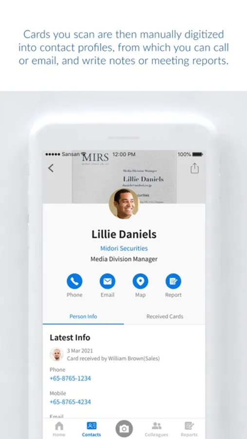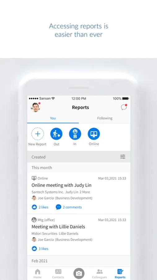 Use the app to enter reports on activity related to registered contacts. Reports recorded in Sansan can be viewed in the order they happened, so you can read up on contacts’ history before you meet with them.