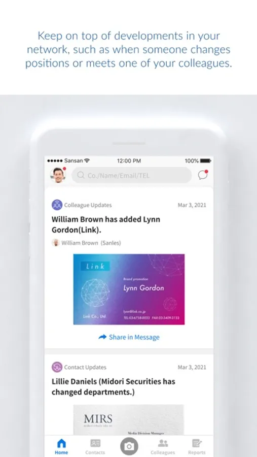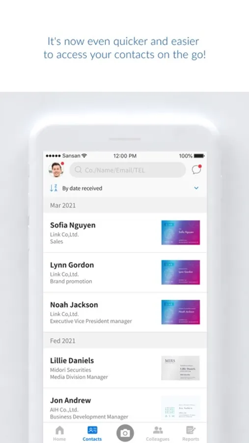 Sansan's Mobile App (available here for users contracting with Sansan) lets you to access an array of valuable information at any time and from anywhere.