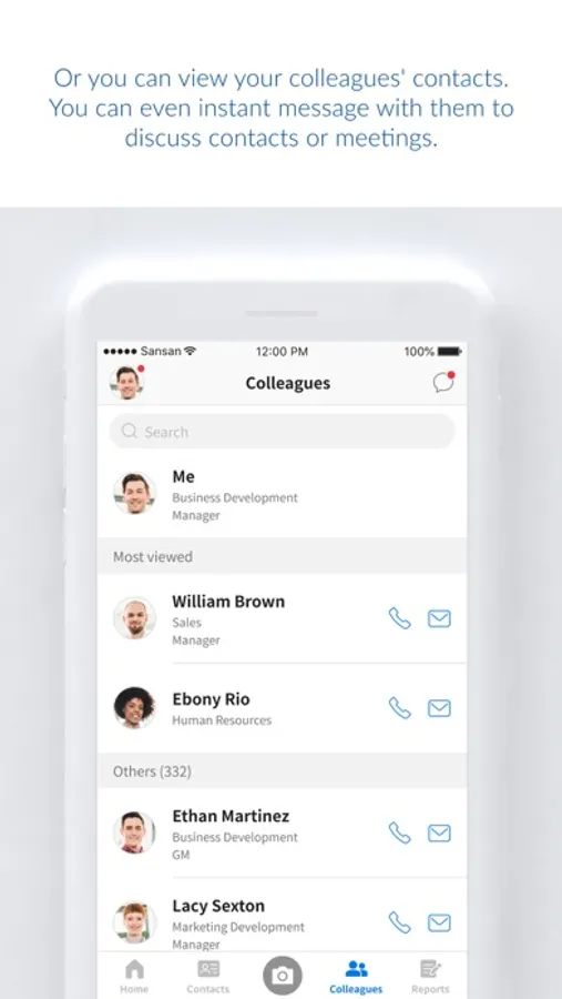 Contact information on internal colleagues (whether across teams, offices, or multiple branches) can be managed along with customer contact information imported through business cards and other sources. Interactions with prospects and customers, and with internal colleagues, can be managed via the Mobile App and in harmony with the Web App.