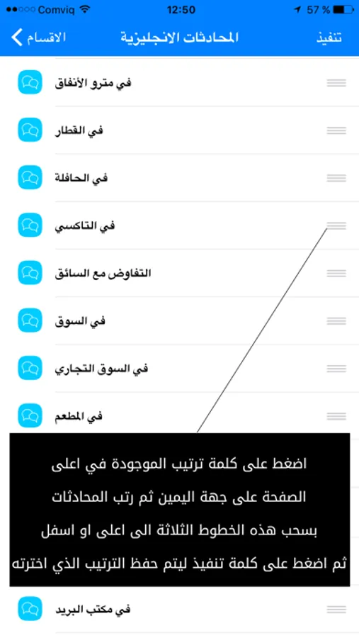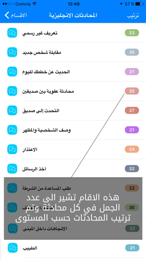 - يحتوي التطبيق على ١٥٠ محادثة انجليزية. كل محادثة لها كلمات مفتاحية مهمة وكذلك اختبار خاص بكل محادثة
