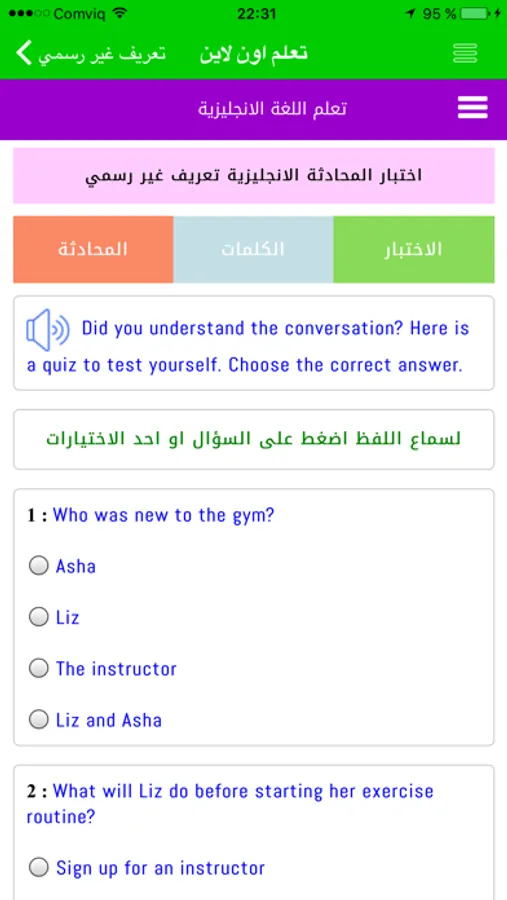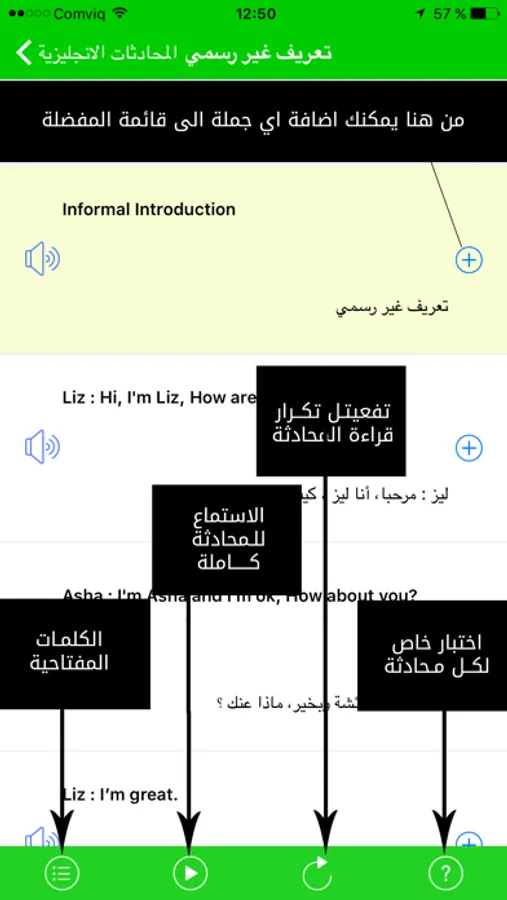 - جميع المحادثات الانجليزية مدعومة بالنطق الصحيح من قبل شخص حقيقي لغته الام هي الانجليزية مع الترجمة للعربية