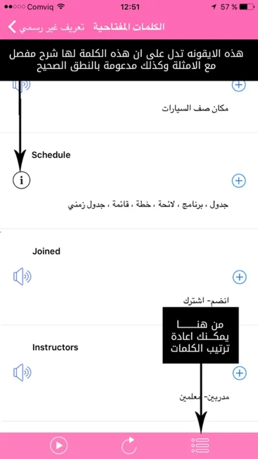 - اختار ما يهمك من الجمل والكلمات واعمل منها قائمة مفضلة واستمع اليه متى ما اردت مع العلم يمكنك عمل قوائم مفضلة بعدد غير محدود