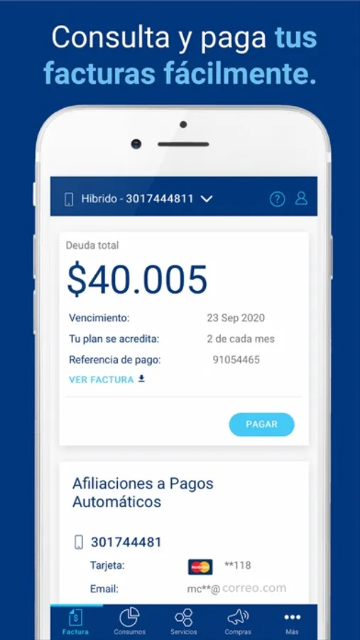 • Paga tu factura en línea con cualquiera de tus tarjetas de débito, crédito ó directamente con botón Bancolombia
