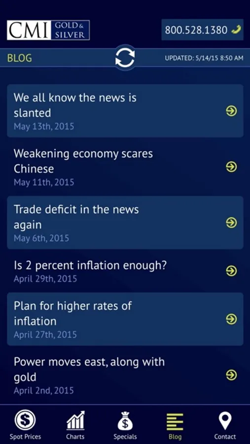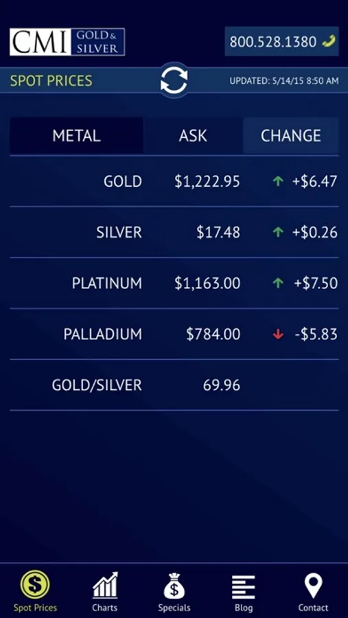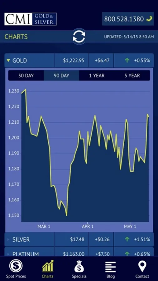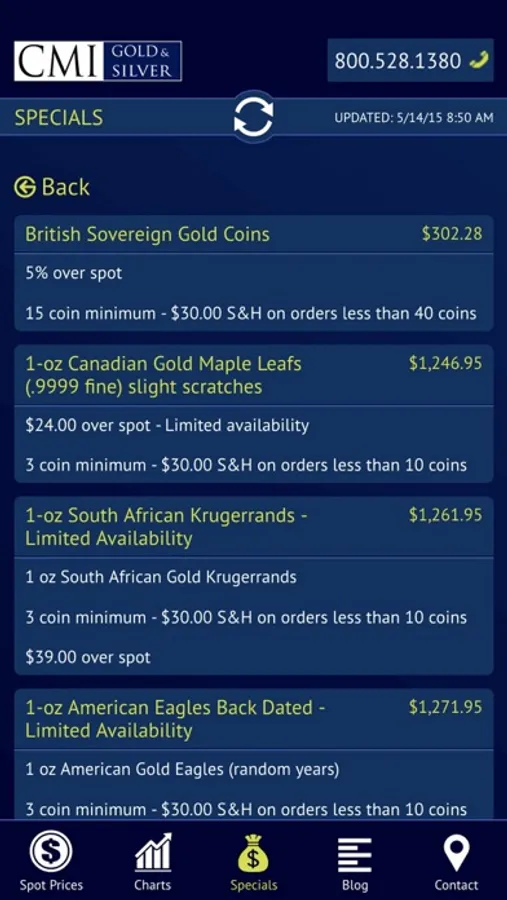 This application provides viewers four features that should be of interest to all precious metals investors. One, they can view live, up to the minute, spot prices for gold, silver, platinum and palladium. Two, interactive charts are available to gain historical perspectives on price action. Three, links to CMI's latest blog posts are provided in an easy to read format. Four, CMI’s Specials are available for investors looking to buy at the smallest premiums over spot.