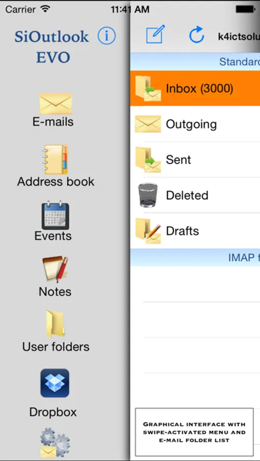 SiOutlook Evo is an evolution of SiOutlook that permits to manage the user e-mails for iPhone/iPad. SiOutlook Evo has the same base structure of SiOutlook with a lot of enhancements and functions, a simpler graphical user interface and a flexible main menu that brings up with a swipe.