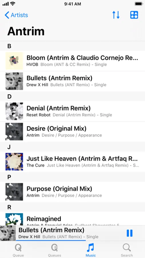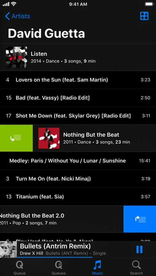 Enqueue songs, albums, artists, playlists, and entire genres from your music library using left-to-right and right-to-left swipe gestures, and rearrange them in the queue however you like by simply dragging!