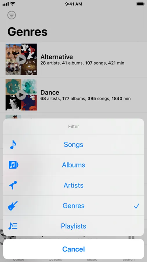 Browse through your music with filters for songs, albums, artists, genres, and playlists. Further refine a selected category by grouping results with the granularity desired.