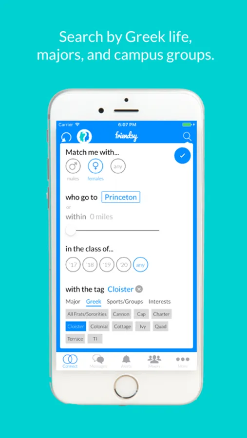 —ADVANCED SEARCH… Want to swipe through Greek affiliated students only? Or maybe just other athletes? How about meeting more students in your major? Friendsy is doing what no social network has done before. You can now search by major, class year, Greek life, sports team, campus organization, and more!