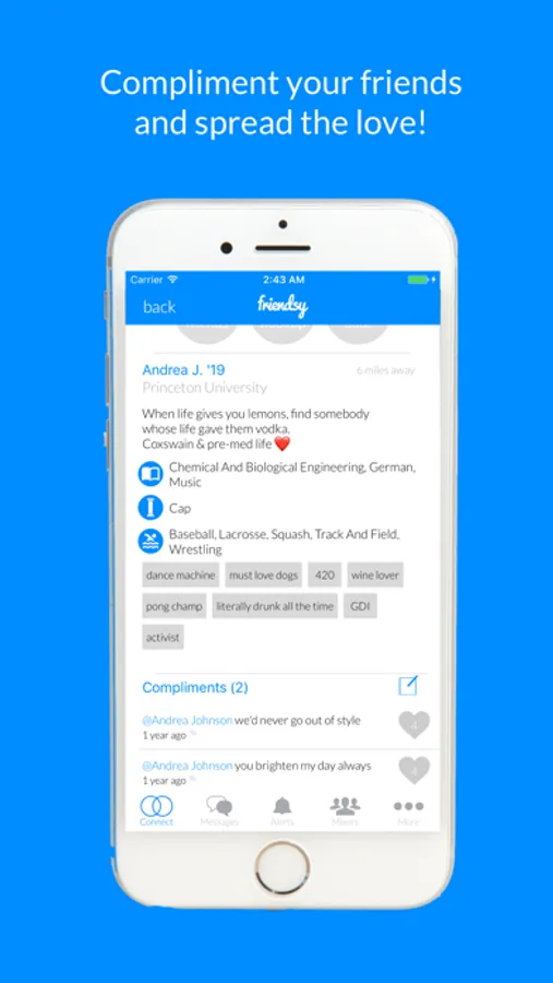 —COMPLIMENTS… Say something nice! With Friendsy's unique “Compliments" feature, you can anonymously compliment other students on your campus, spreading positive energy around your school!