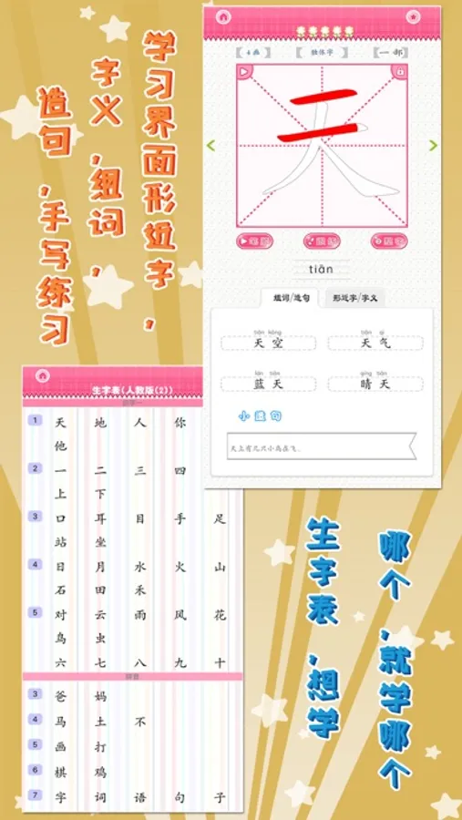 * 笔顺动画演示和整字练习等,帮助孩子实现书写规范,实现手脑并用能力的提升。