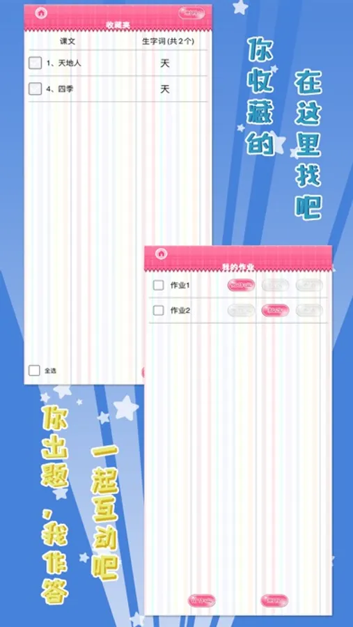 * 家长可以在此处针对孩子认识不深刻的生字进行留作业,孩子在完成后,可以进行批改和查看。