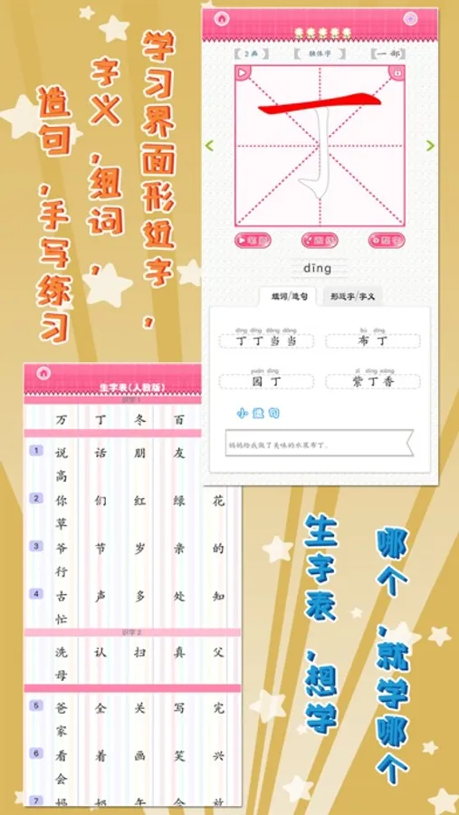 * 笔顺动画演示和整字练习等,帮助孩子实现书写规范,实现手脑并用能力的提升。