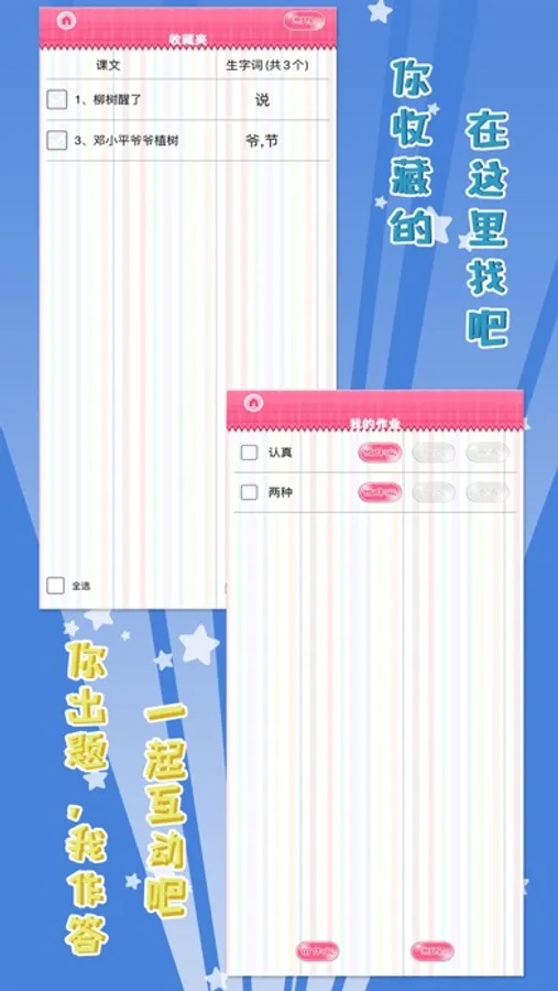 * 家长可以在此处针对孩子认识不深刻的生字进行留作业,孩子在完成后,可以进行批改和查看。