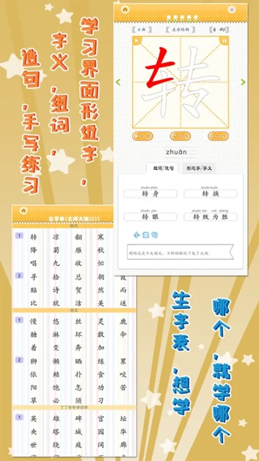 特色: 通过笔顺笔画的书写检查来帮助孩子实现书写规范,提升动手能力。 配有组词、造句和测试,让孩子轻松识字的同时爱上写字 !