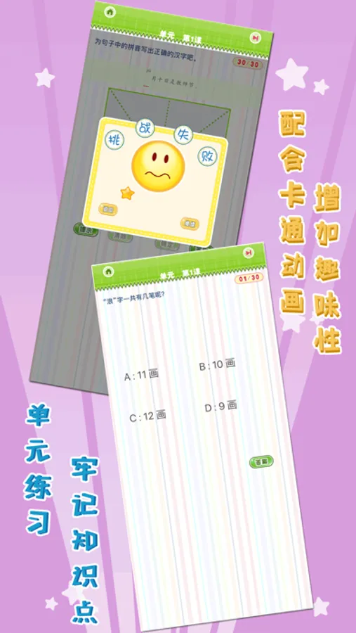 * 挑战时的笔画笔顺提示,可以加深孩子对汉字的印象。