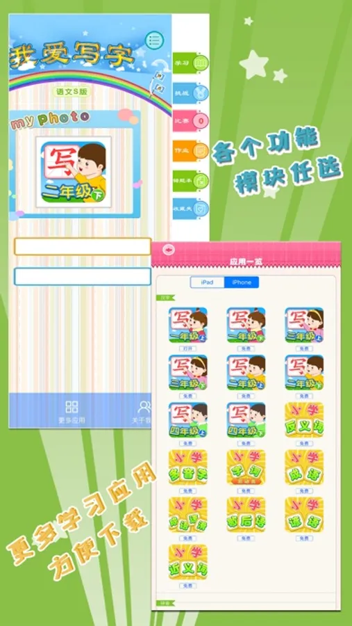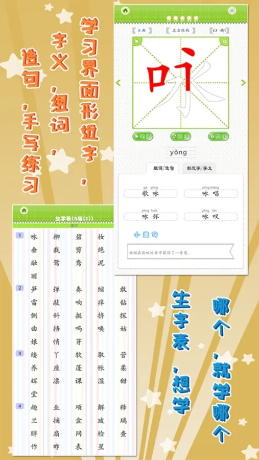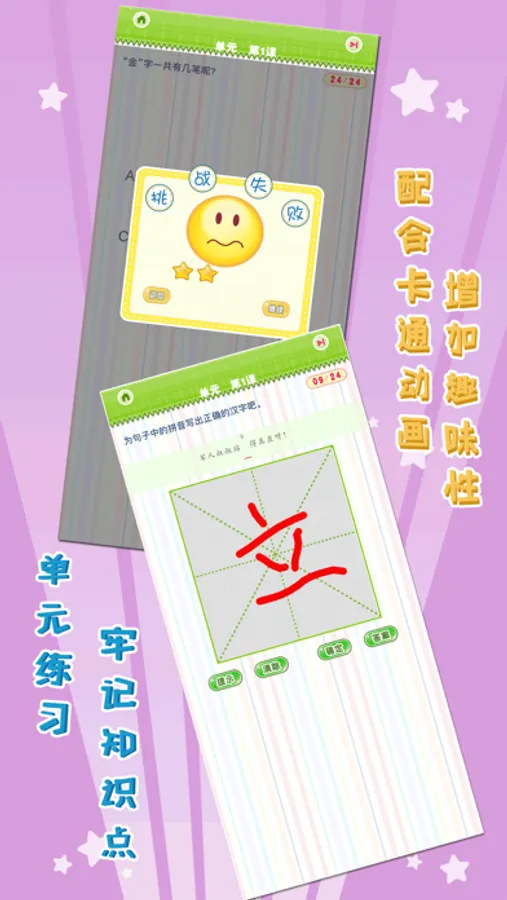 * 笔顺动画演示和整字练习等,帮助孩子实现书写规范,实现手脑并用能力的提升。