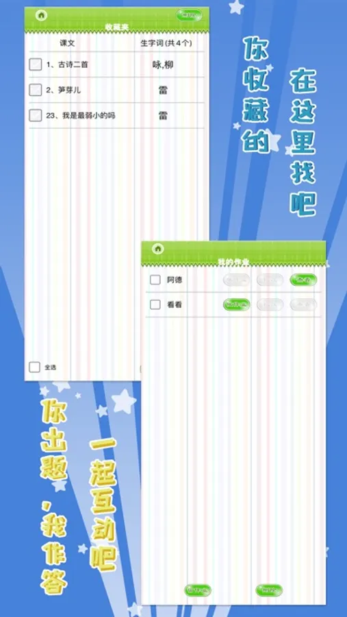 * 家长可以在此处针对孩子认识不深刻的生字进行留作业,孩子在完成后,可以进行批改和查看。