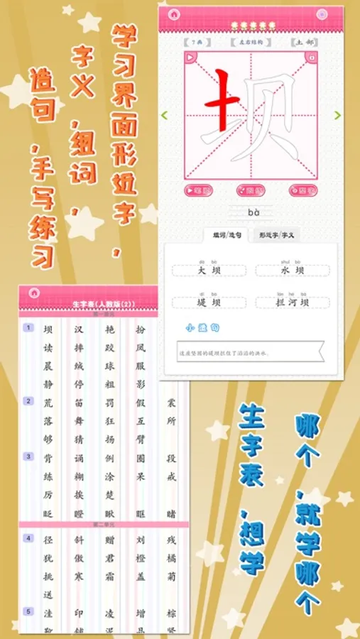 * 拼音、组词、造句都可以点击发音并配有动画,方便跟读和理解汉字。