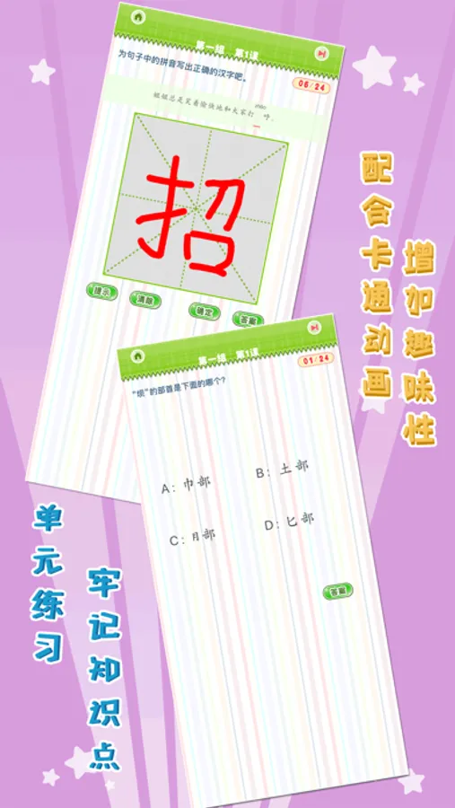 * 笔顺动画演示和整字练习等,帮助孩子实现书写规范,实现手脑并用能力的提升。