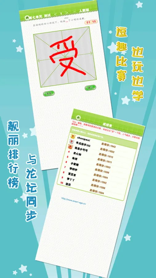 * 排名榜和重赛功能,积极的激发孩子的竞争意识,更有意想不到的大奖等待赢取。