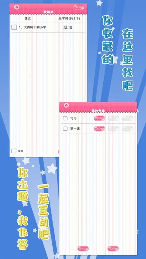 * 家长可以在此处针对孩子认识不深刻的生字进行留作业,孩子在完成后,可以进行批改和查看。