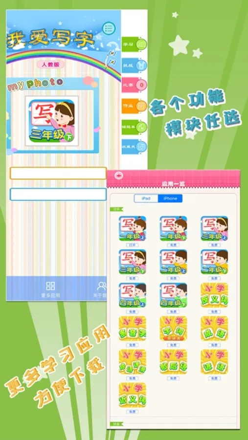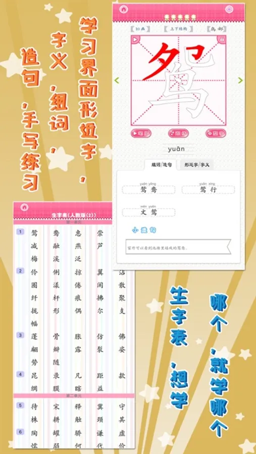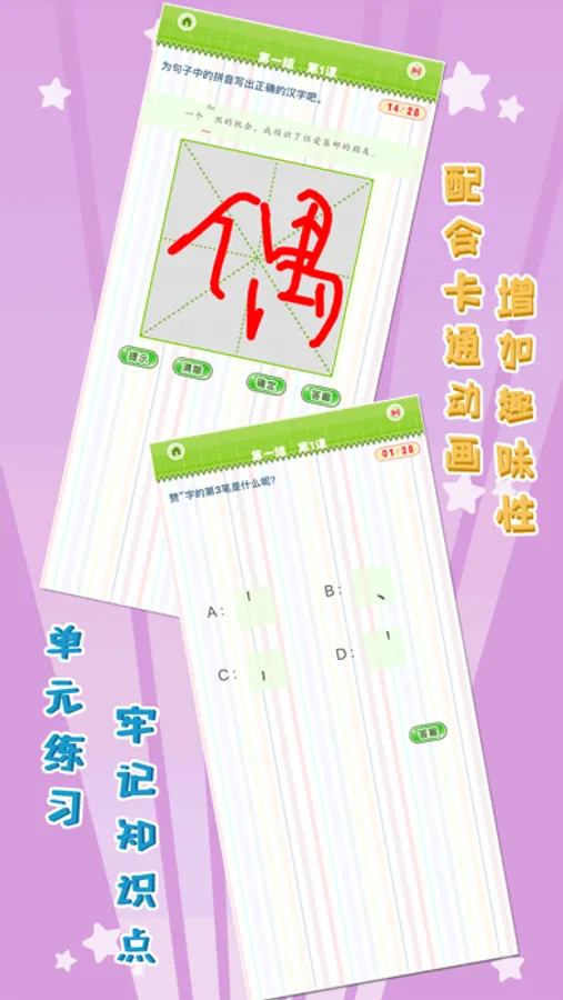 * 笔顺动画演示和整字练习等,帮助孩子实现书写规范,实现手脑并用能力的提升。