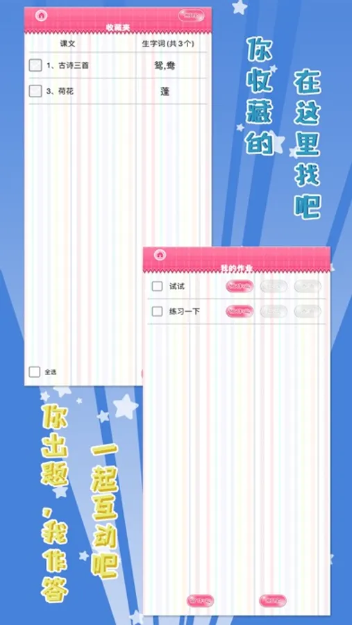* 家长可以在此处针对孩子认识不深刻的生字进行留作业,孩子在完成后,可以进行批改和查看。