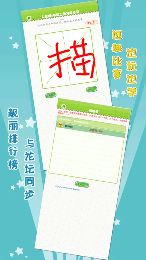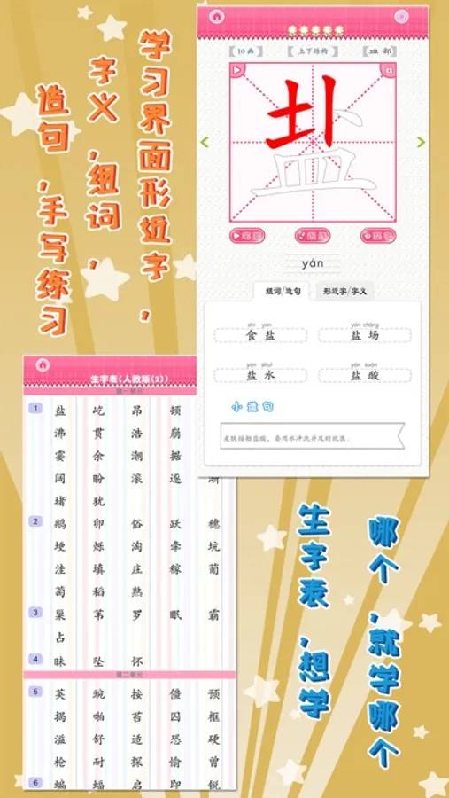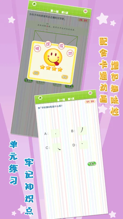 * 笔顺动画演示和整字练习等,帮助孩子实现书写规范,实现手脑并用能力的提升。