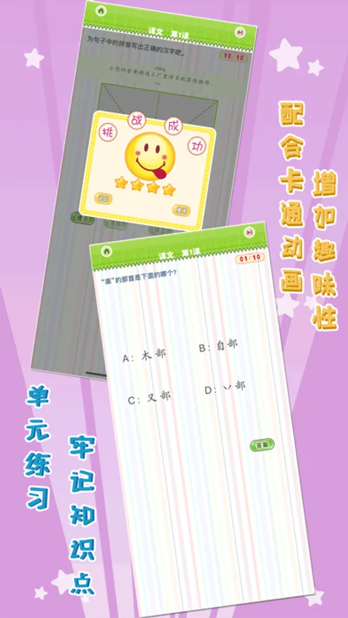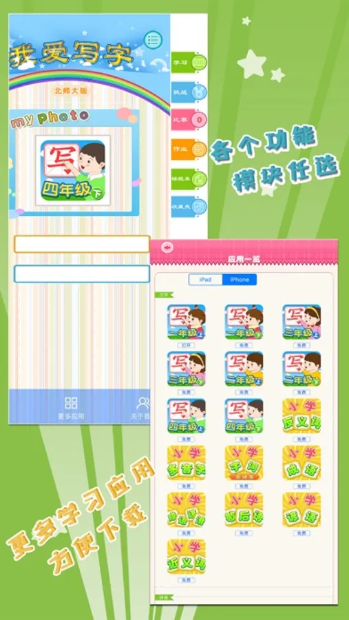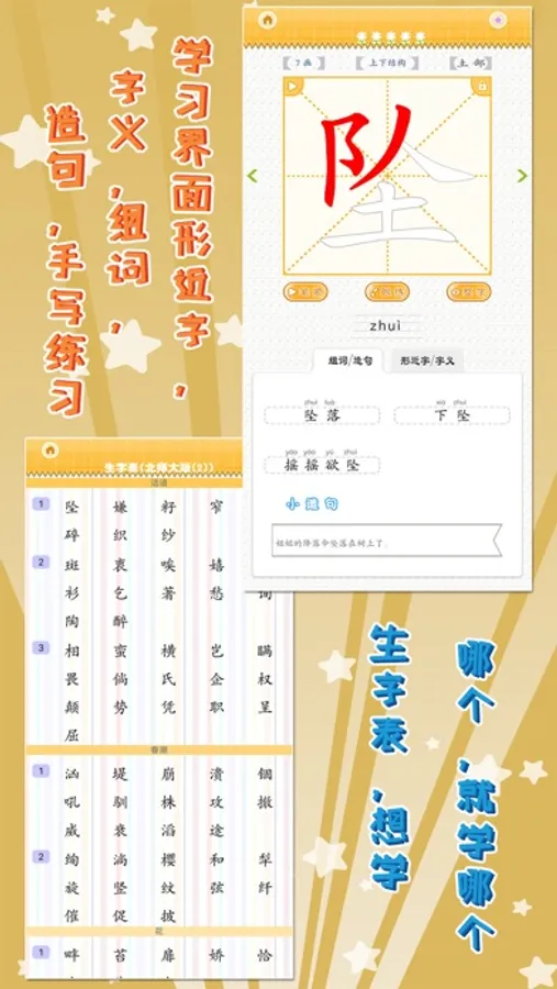 * 笔顺动画演示和整字练习等,帮助孩子实现书写规范,实现手脑并用能力的提升。