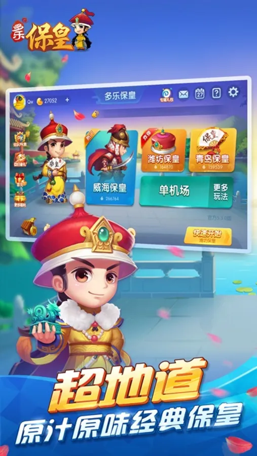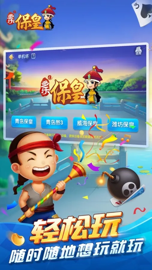 风靡全山东的特色经典游戏—多乐保皇,不仅包含单机版、联网版,而且还囊括了青岛玩法、威海玩法、潍坊玩法,同时还分进贡、非进贡场次。免费下载,安装后即可游戏,每天数十万玩家在线,无需担心人手不够,分分钟让你开始打保皇。