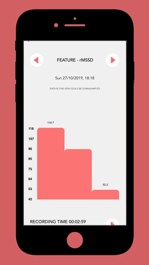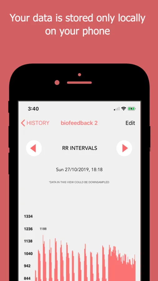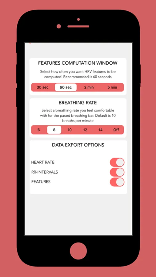 - data export/storage on iTunes and Dropbox (csv format, exports heart rates, rr intervals, events and computed features). Data export needs to be performed from the history → recording view, by clicking on the export button (bottom left).