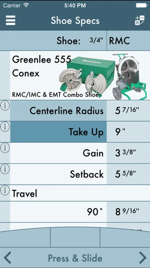 Shoe Specs: Edit and view the information about the selected bender. With a simple click and drag you can change the Centerline Radius (this information can usually be found on the bender’s shoe) or the Take-Up of the specific shoe size being used. Quickly discover additional information about the specified bender’s shoe such as the Gain, Setback, Travel and Radius Adjustment.