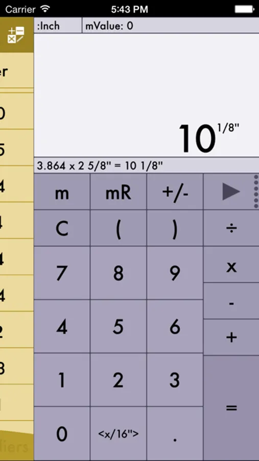 Calculator: Simple, yet sophisticated. It contains functions such as addition, subtraction, multiplication, and division. Also includes the ability to store and recall memory, squaring, and calculating the square root. The calculator gives you the ability to quickly transpose from Fraction:Decimal and Decimal:Fraction. Easily mixing formulas such as 2.61 x 3 ¼”.