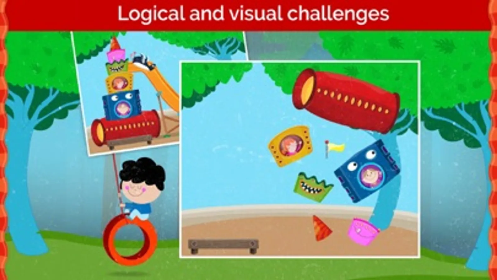 A set of stacking games. The game is designed to help children acquire basic concepts such as: big VS. small, before VS. after, and bottom VS. top. Game boards are organized in an ascending difficulty level.