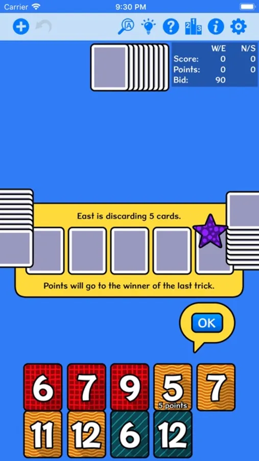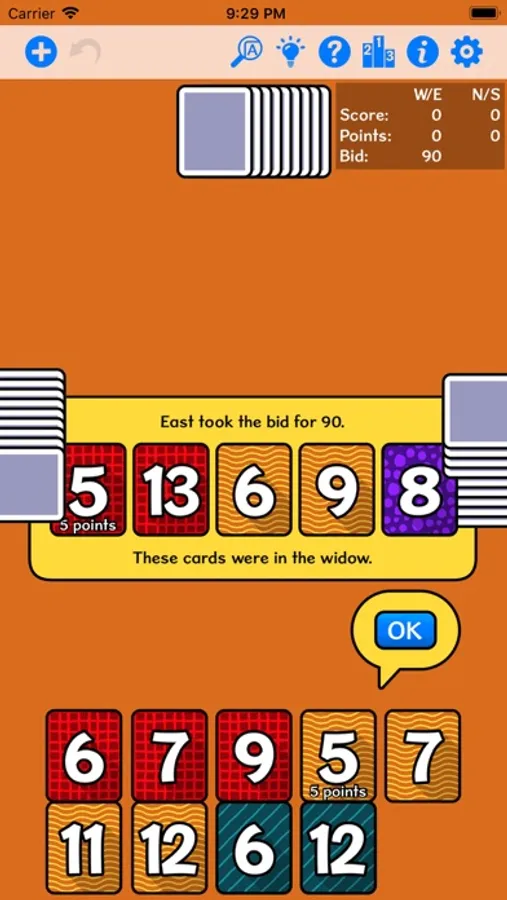 Widow, Naming Trump: The high bidder collects the 5 widow cards (which are shown to all players), names a trump suit for the hand, and discards 5 cards from her hand (not shown to the other players). The 5 discards can include point cards which will, depending on your settings, go to either the high bidder or the winner of the last trick.