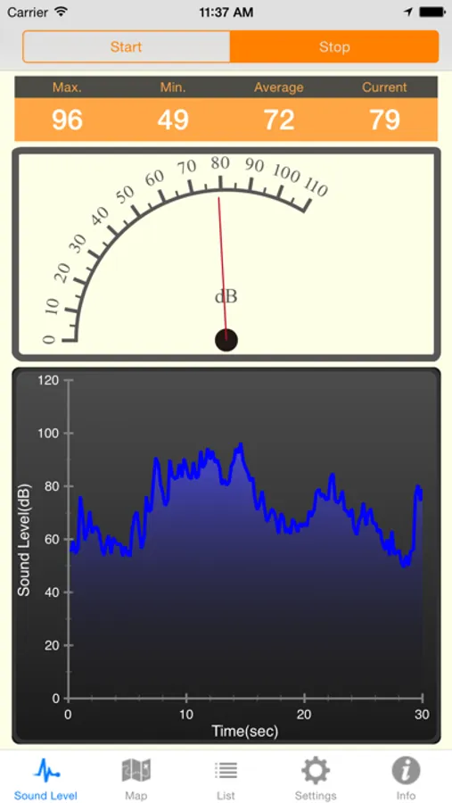 This app is primarily used to measure sound level of surroundings. It contains the following features: