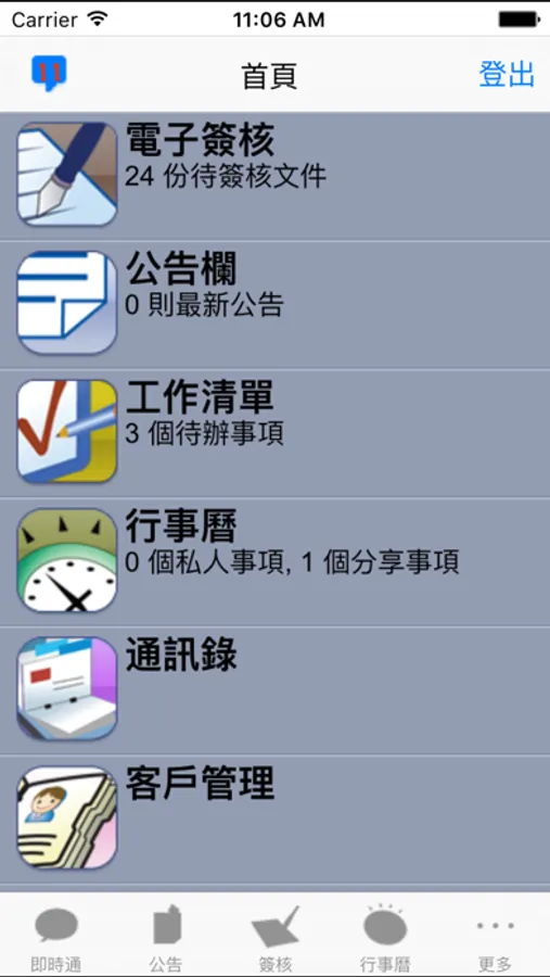 目前提供手機版的:電子簽核、即時通、工作清單、公告欄、行事曆、客戶管理、專業管理等多樣Netask常用的功能。