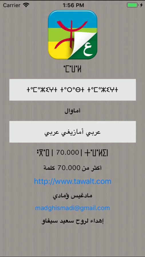 نحن سعداء أن نضع بين أيديكم أول معجم أمازيغي عربي أمازيغي يعمل على نظام الأبل (ios) وهو بمثابة أول معجم جيب أمازيغي يتبع سلسلة معاجم بلغات شتّى يتم إنزاله مجاناً. سلسلة المعاجم التي نحن بصدد إصدارها سوف تتضمن معجم أمازيغي إنجليزي وآخر فرنسي أمازيغي تهدف وتستقطب المتحدث باللغة الأمازيغية بالدرجة الأولى وكل من له رغبة في تعلمها، يحتوي المعجم الأمازيغي العربي على أكثر من 70000 كلمة، موضوعة حسب الترتيب الألفبائي وليس الجذور لتُسهِّل عليكم عملية الوصول للكلمة. نود أن ننوه أن هذا هو الإصدار الأول للمعجم والذي سوف يتبعه ثلاث إصدارات بحيث نتوقع أن يصل عدد الكلمات لأكثر من 100000 كلمة منها الكلمات المركبة، والتي يستعملها طلبة اللغة الأمازيغية في المغرب وليبيا خاصّة، هذا المعجم مبني على عدة معاجم أمازيغية متوفرة للقراء من أهمها المعجم العربي الأمازيغي للأستاذ القدير محمد شفيق، والمعاجم الأمازيغية المتخصصة الأخرى وتجميعات شخصية طبعاً. من أهم مزايا المعاجم الإلكترونية هي سهولة الإضافة والتصحيح، وهنا نهيب بالمستخدم بأن يُعِيننا قدر المستطاع بتصحيح والإضافة وكذلك النصحية لنرتق بمعجمنا هذا. نحن نرحب بأي نقد بناء يرفع من شأن لغتنا. يحتوي المعجم في قسمه العربي على خاصية البحث وهو مقسم لنوعين : 1 - البحث المتخصص بالكلمة بمعناها المباشر 2 - البحث فيما تحتويه الكلمة من معاني وهو أوسع. وفيما يتعلق بالقسم الأمازيغي يمكنكم البحث بالتيفيناغ أو بالحرف العربي لمن لا يعرف الكتابة بالتيفيناغ. كما يحتوي المعجم على خاصية الإضافة للمفضلة، وخاصية الكلمة اليومية التي سوف تساهم في الإضافة للمحصلة المعجمية للطالب، مع إمكانية تصفح المعجم كاملا حسب الترتيب الألفبائي. ومن أهم الخصائص أنه يمكنك المشاركة بالكلمات عن طريق البريد الإلكتروني أو أي من وسائل التواصل الاجتماعي وأهمها الفيسبوك. أخيرا وليس آخرا قمنا بالتسهيل علي المستخدم بإضافة خاصية التحكم في شكل المعجم بحيث يمكنه أن يغير نوع الخط ولونه وكذا حجمه، كما أننا نعدكم بأننا سوف نقوم بإضافة كل ما هو جديد ومفيد لمعجمكم هذا في المستقبل القريب. إن أعجبكم وإستفدتم من معجمنا هذا نتمنى منكم إضافة عدد من النجوم حسب إستفادتكم وكذا إضافة أي ملاحظات ترونها مناسبة فسوف يرفع هذا من شأن معجمنا عند أي تونز.
