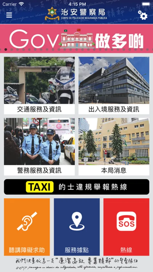 澳門治安警察局「警務易」應用程式由澳門特別行政區治安警察局製作,主要提供澳門治安警察局資訊,包括: