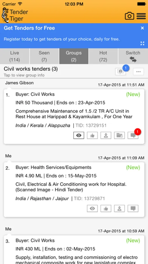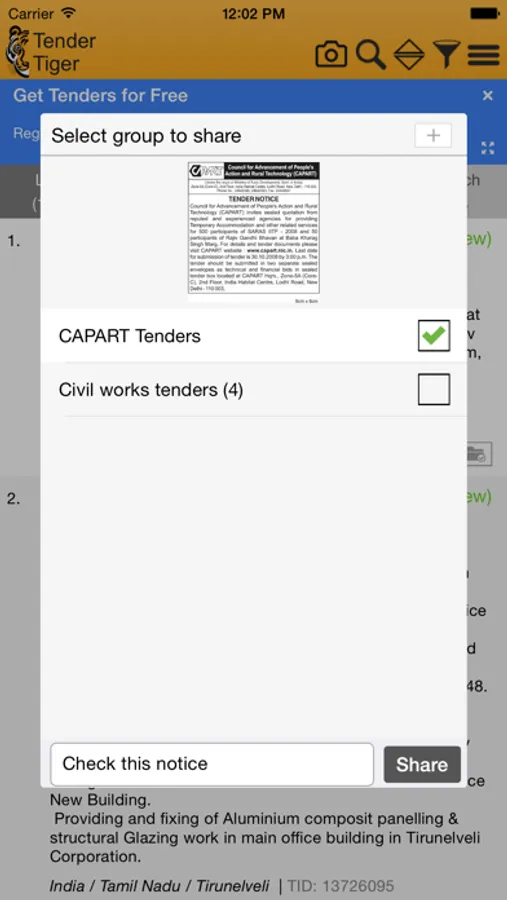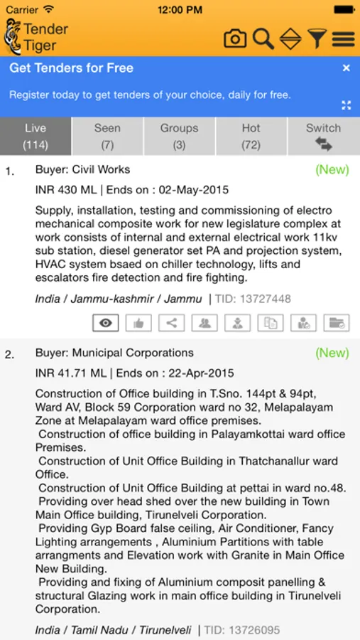 TenderTiger app allows you to track business opportunities in form of RFQ, Tenders, EOI, Auctions, Sub contracting, JV/consortium, supplier enlistment, etc. from all over the world. This App allows you to download/view/share/like all tenders of your choice out of 2 Million new opportunities from Government & Private sector TenderTiger tracks annually. All Tenders of your choice will be saved in your mobile phone such that you can search/view even in offline manner. You need to be a registered member of TenderTiger to avail this service.