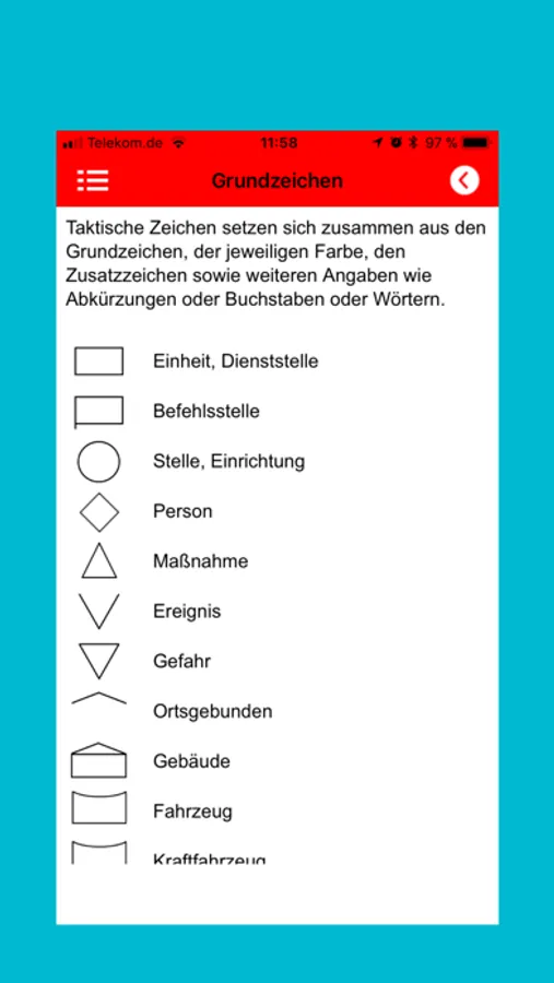 Über 250 taktische Zeichen sortiert nach Organisationen stehen zur Verfügung. Durch das Upgrade sind es insgesamt sogar über 1450! Unhandliche Taschenkarten haben ausgedient. Jetzt hast du alle wichtigen taktischen Zeichen immer auf dem Smartphone dabei! Du benötigst bestimmte taktische Zeichen immer wieder? Schiebe sie einfach in die Favoriten, dann hast du sie sofort zur Hand. Spezielle taktische Zeichen fehlen im Nachschlagewerk? Schreib uns eine E-Mail, wir kümmern uns darum!