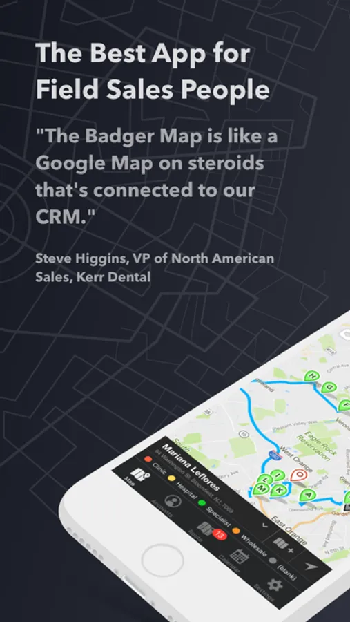Badger is designed with all the needs of field salespeople in mind. It takes care of all of their challenges with multiple features: route optimization (with 100+ stops), lead generation, interactive client data visualization (import your spreadsheet or sync Badger with your CRM), meeting notes logging, field activity reports, and more!