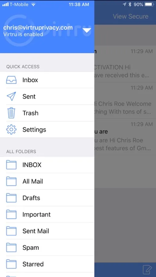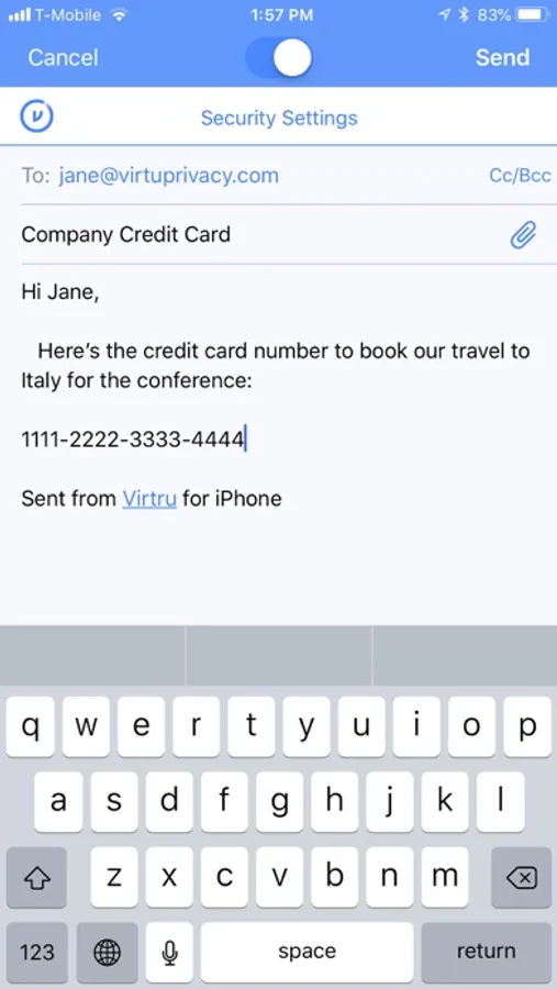 Protect email messages and attachments sent from your iOS device and gain the confidence to collaborate while maintaining control of your data. Virtru Email Protection is secure (256-bit encryption). It gives you end-to-end encryption and access controls that prevent unauthorized access by third parties, ensuring privacy and compliance.