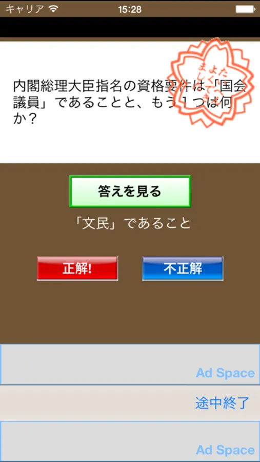 中学・高校レベルの政経・公民問題を、一問一答形式で1800問収録したアプリです。中学高校の政経・公民教科の学習にも使えますが、政経・公民系の問題は社会常識問題的な側面が強いので、日常生活に必要な常識を養うために、楽しみながら挑戦してみてください。また、政経・公民系の問題は、就職試験、公務員試験、専門学校の入学試験などでもよく出題されます。就職試験対策や公務員試験対策にもご利用ください。
