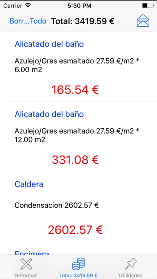 Desde esta sección podrás ver todas las reformas que has añadido y el total del precio.