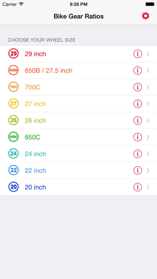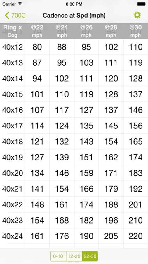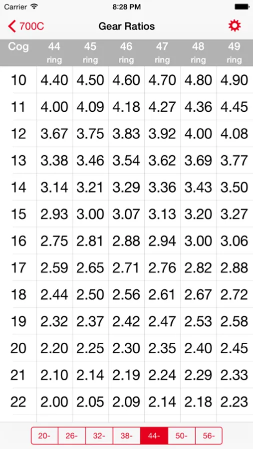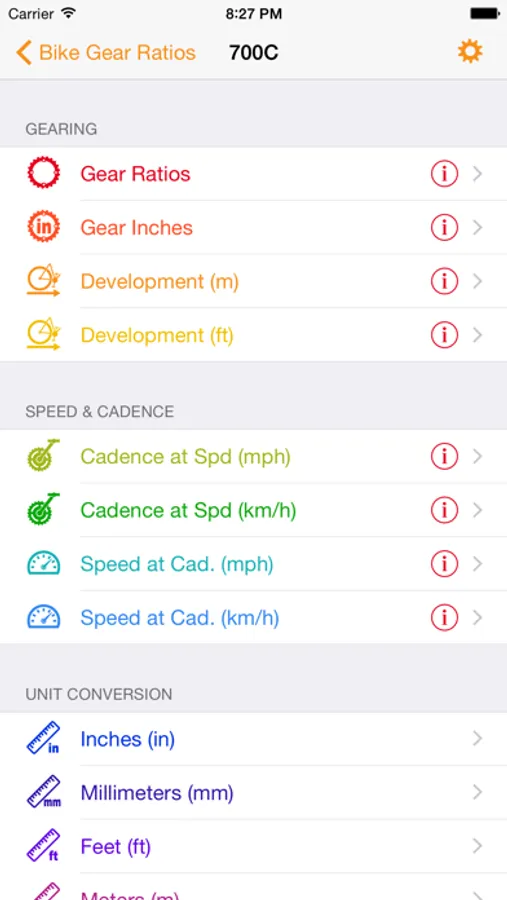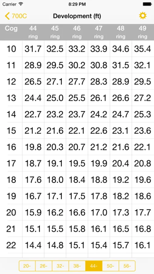 The Bike Gear Ratios app provides tables for calculating Gear Ratio, Gear Inches, Development, Cadence at Speed and Speed at Cadence when comparing different Chainring and Cog combinations for your multi speed or single speed bike, taking into account a specific wheel size. It also includes unit conversions between US/UK units and Metric units.