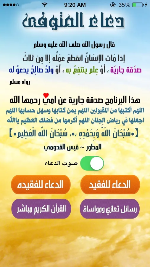يحتوي التطبيق على ادعية للمتوفى بصيغة الدعاء للذكر اوالانثى يمكنك قرائتهم بأي وقت تشاء