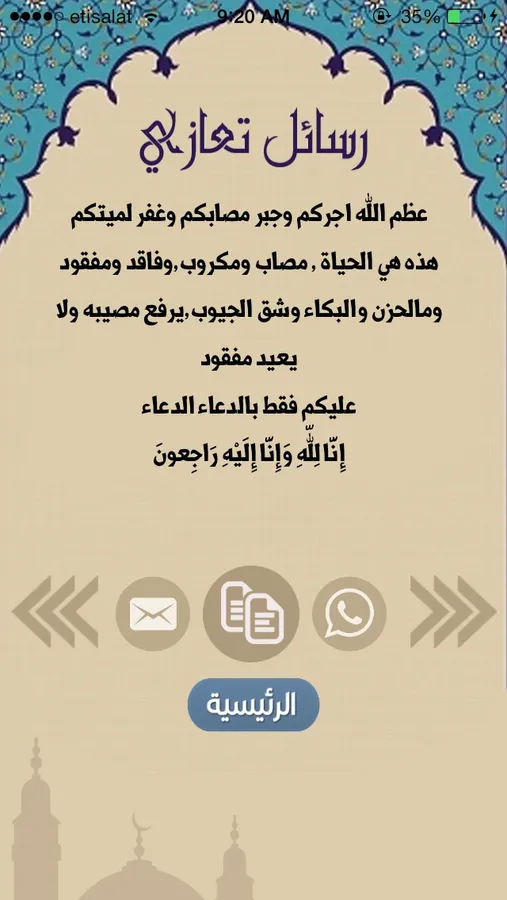 كما يحتوي التطبيق على رسائل مواساة وتعزية يمكنك ارسالها مباشر برسالة نصية او الى اي برنامج محادثة كالوتس اب