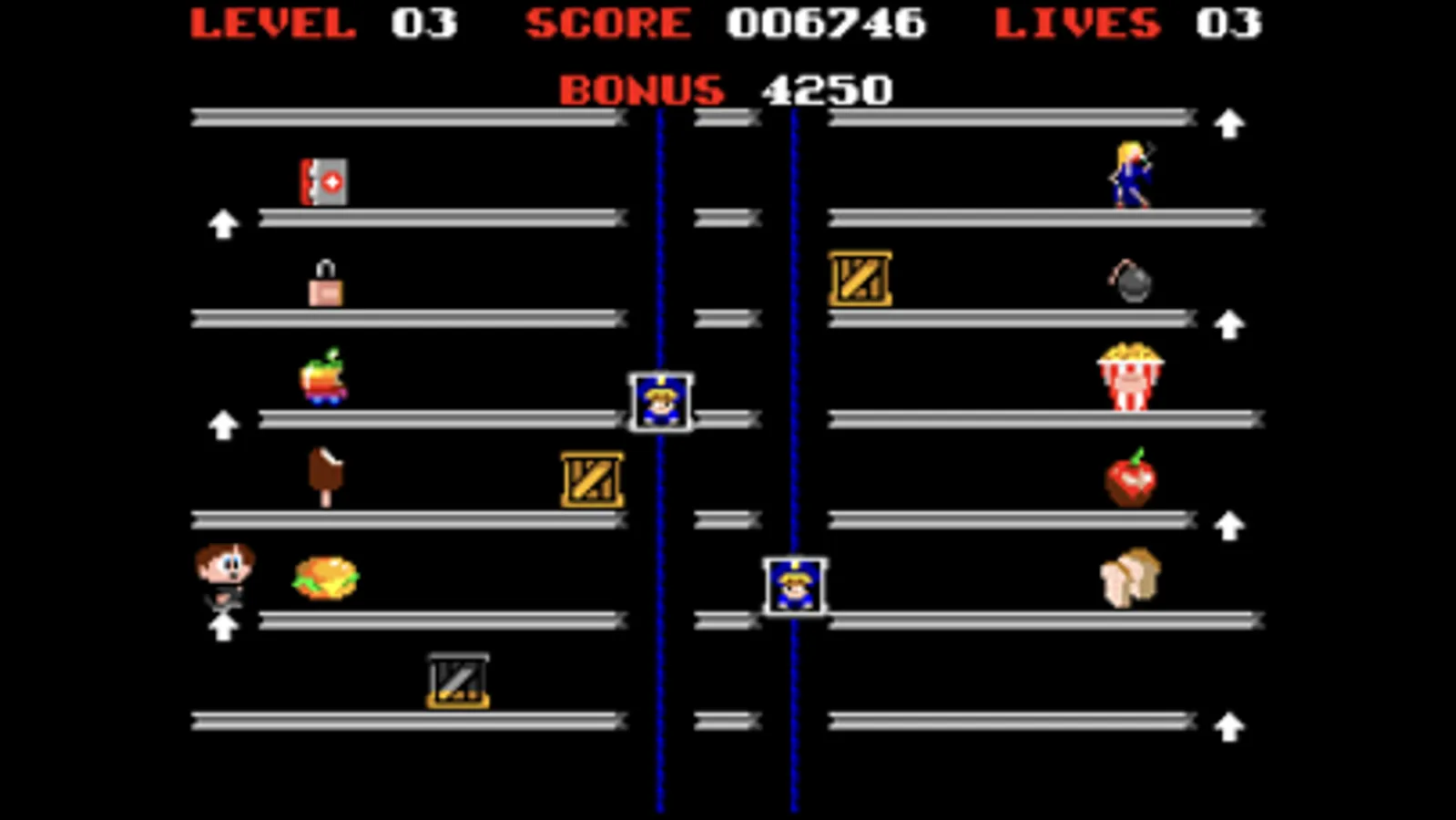 Nifty Lifty is a simple game. The player must collect various items such as hearts, small toys, tanks, umbrellas, and climb up while avoiding dangerous lifts going up and down. Each contact with a lift results in a loss of life. The character is controlled by tapping either side of the screen to move left and right. When the edge of the screen is reached, where the arrow is, the game automatically moves the character to the upper floor. A time bonus is provided for completing levels quickly.